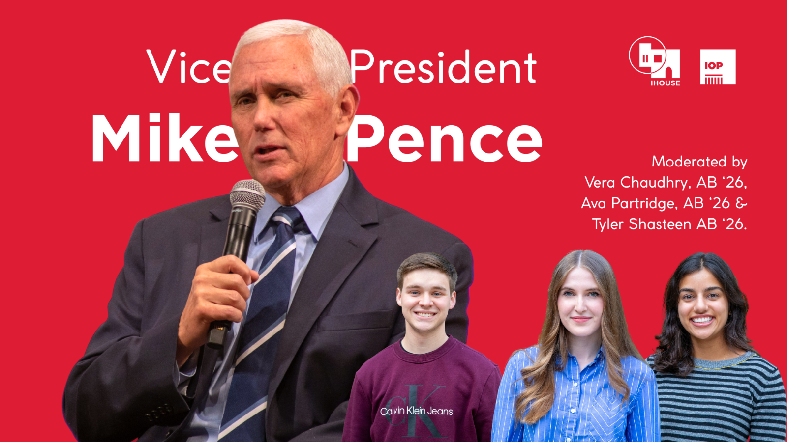 Join Vice President Mike Pence for a conversation across difference with three University of Chicago students – with topics ranging from populism to religion to the future of bipartisan lawmaking to the role of the executive branch. Moderated by Vera Chaudhry AB ‘26, Ava Partridge AB ‘26, and Tyler Shasteen AB ‘26.